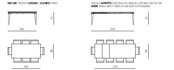 Chiuso 160 x 90 H 75 cm _ Aperto 200/240 x 90 H 75 cm