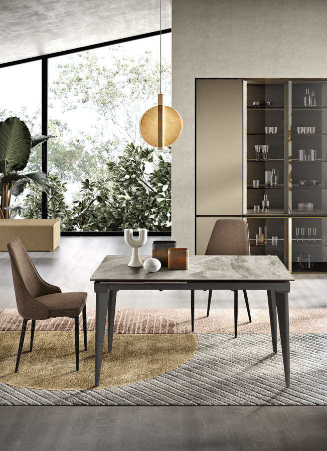 Tavolo allungabile telescopico con base in metallo verniciato e top in grès porcellanato