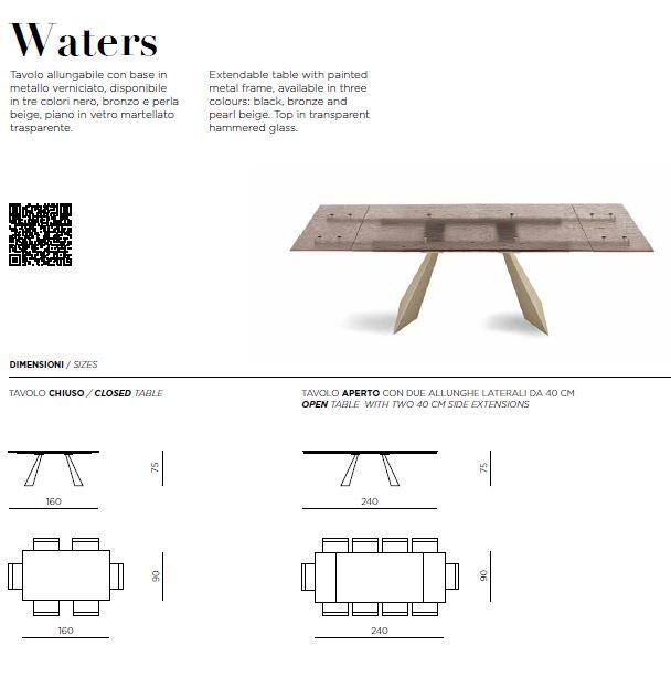 Waters è un tavolo allungabile che esalta il contrasto tra l’essenzialità del metallo e la raffinatezza del vetro. Il