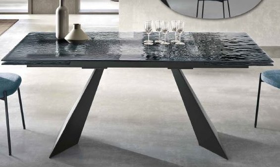 Waters è un tavolo allungabile che esalta il contrasto tra l’essenzialità del metallo e la raffinatezza del vetro. Il