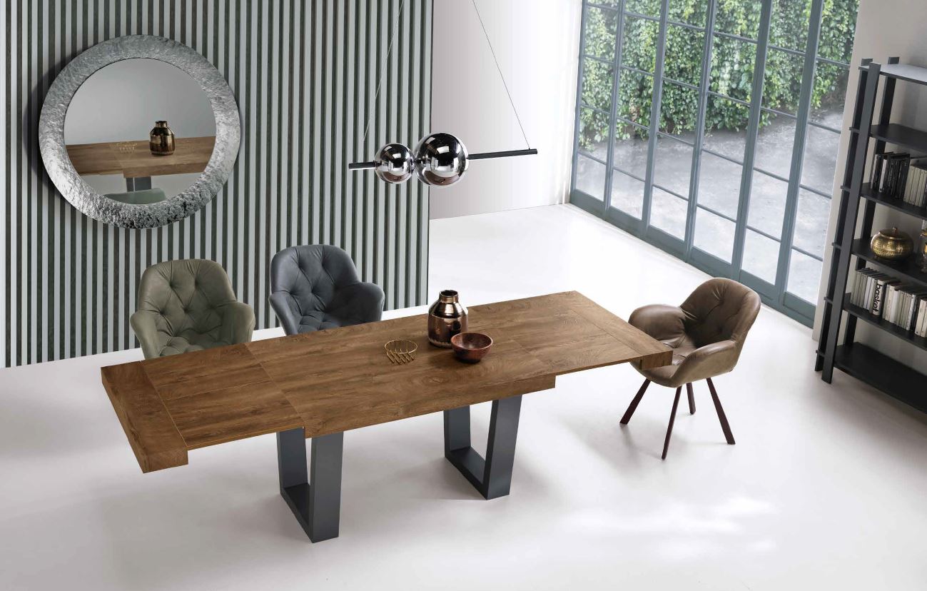 Tavolo allungabile con struttura, piano ed allunghe in laminato effetto legno. Due allunghe laterali da 50 cm.