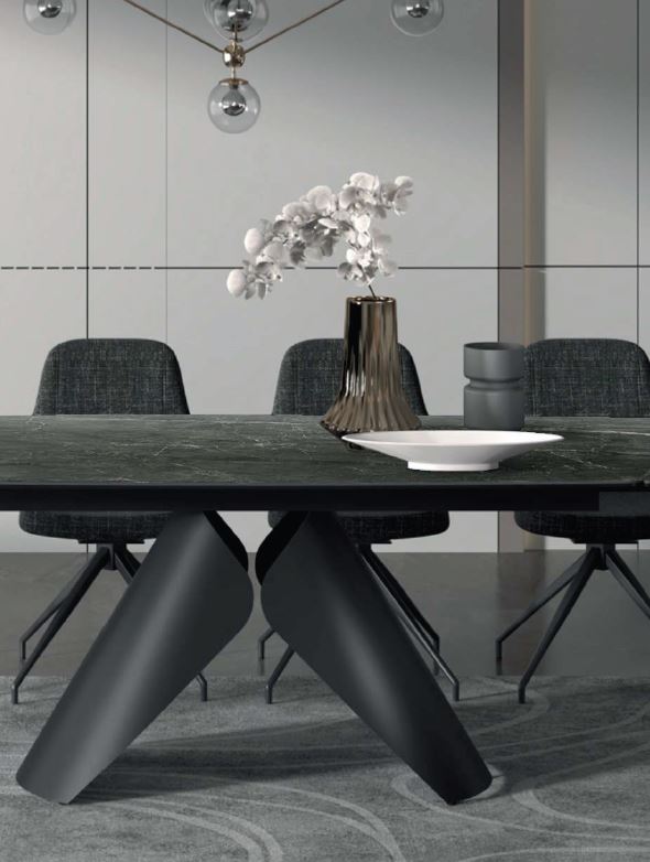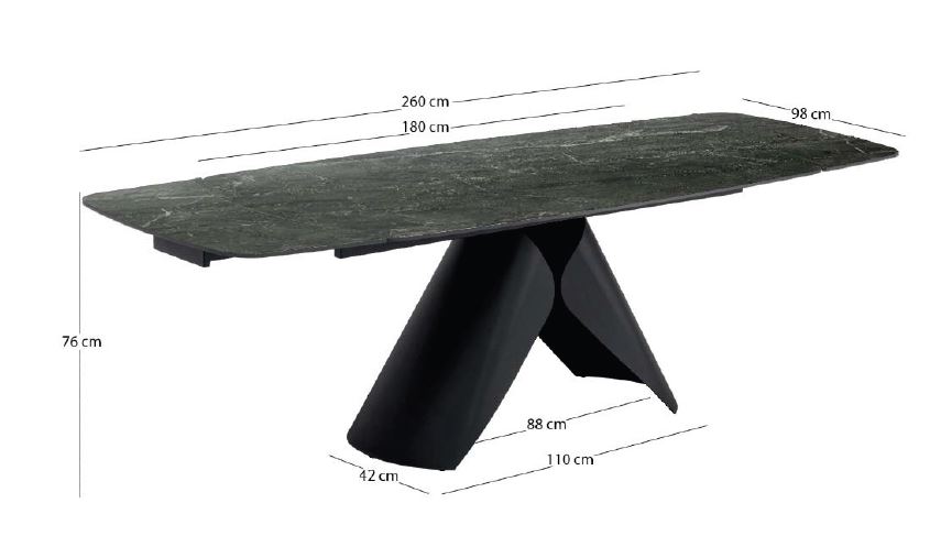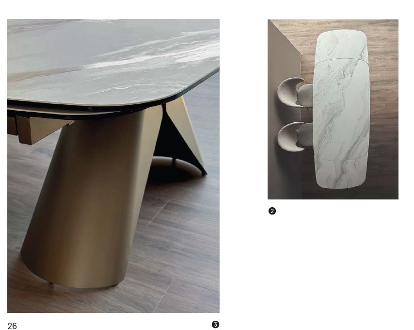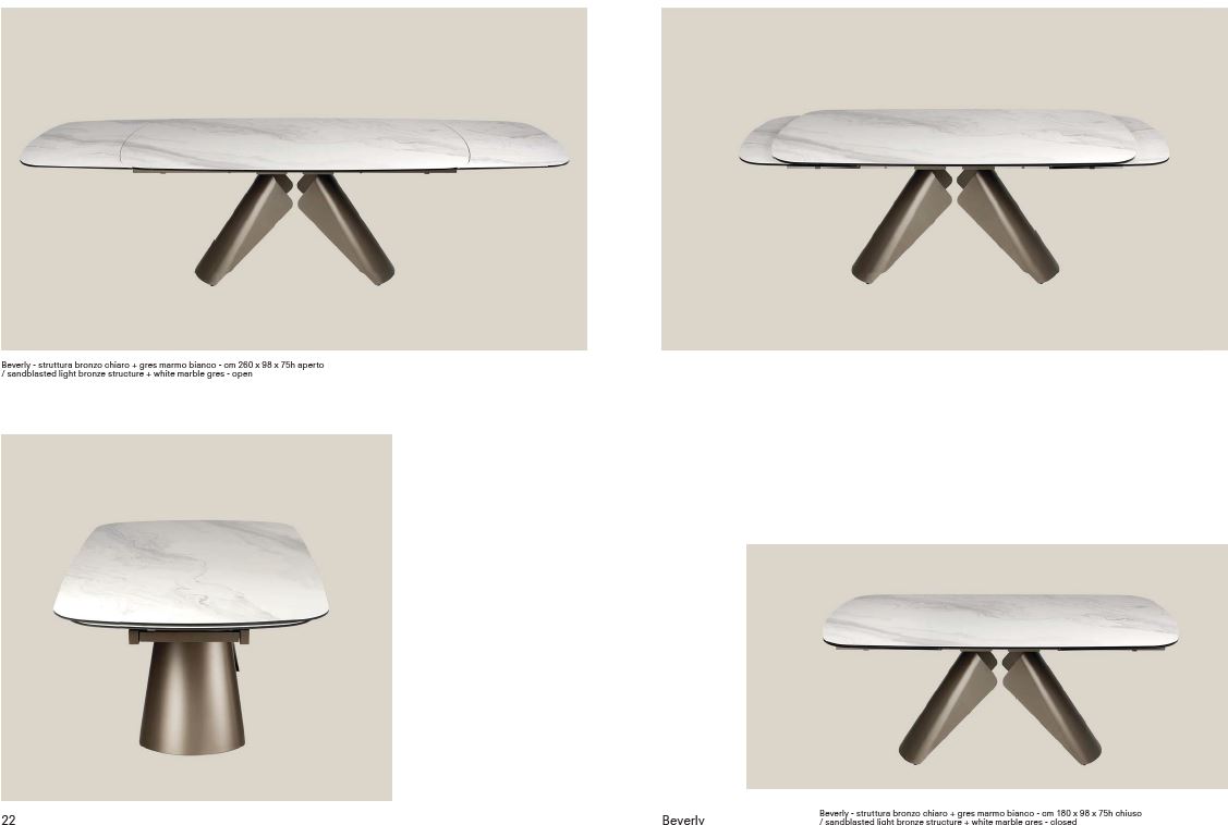 La struttura dal design ricercato di questo splendido tavolo allungabile è realizzata in solida lamina d’acciaio ad alto spessore, verniciata con finiture a polveri epossiche, e si sposa perfettamente con i sofisticati e resistenti top in gres opaco da 3 mm accoppiati a vetro fumé da 10 mm di spessore. Questo imponente tavolo con top a botte misura chiuso 180 x 98 cm e con 2 allunghe laterali raggiunge aperto 260 x 98 cm. Top, struttura e allunghe in acciaio sono strutturate per sopportare grandi carichi senza inconvenienti. Il tavolo è disponibile in 2 varianti. Top in gres decoro marmo bianco opaco con una favolosa venatura lucida a contrasto, combinato con struttura bronzo chairo oppure marmo grigio opaco combinato alla struttura nera
