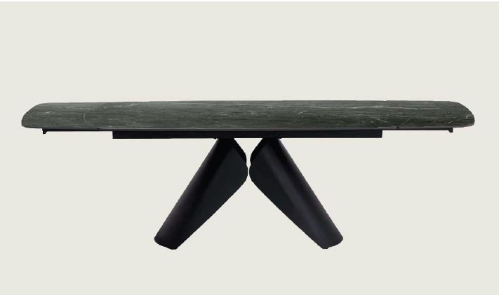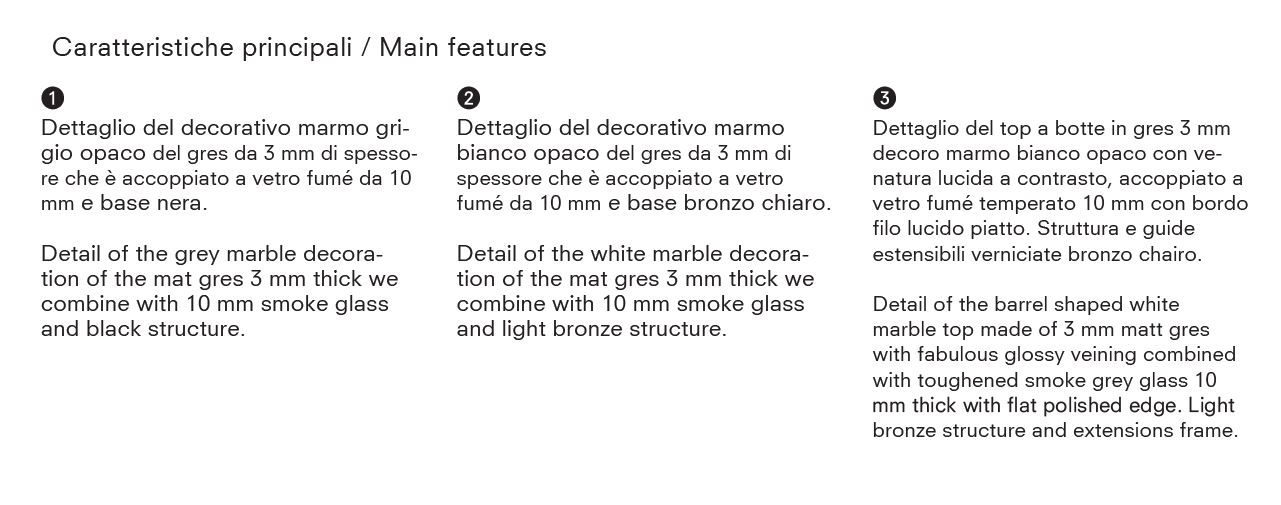 La struttura dal design ricercato di questo splendido tavolo allungabile è realizzata in solida lamina d’acciaio ad alto spessore, verniciata con finiture a polveri epossiche, e si sposa perfettamente con i sofisticati e resistenti top in gres opaco da 3 mm accoppiati a vetro fumé da 10 mm di spessore. Questo imponente tavolo con top a botte misura chiuso 180 x 98 cm e con 2 allunghe laterali raggiunge aperto 260 x 98 cm. Top, struttura e allunghe in acciaio sono strutturate per sopportare grandi carichi senza inconvenienti. Il tavolo è disponibile in 2 varianti. Top in gres decoro marmo bianco opaco con una favolosa venatura lucida a contrasto, combinato con struttura bronzo chairo oppure marmo grigio opaco combinato alla struttura nera