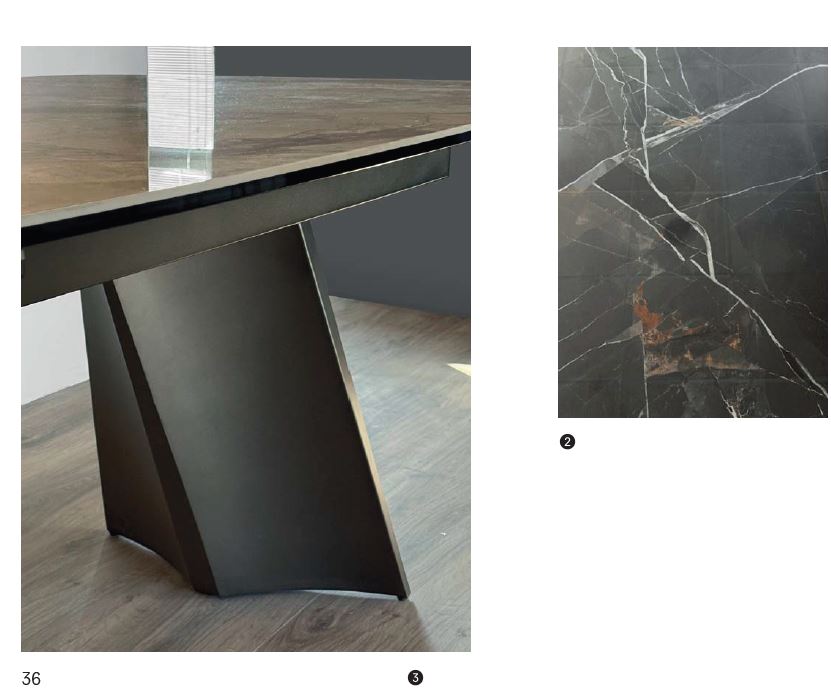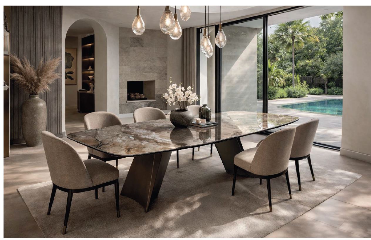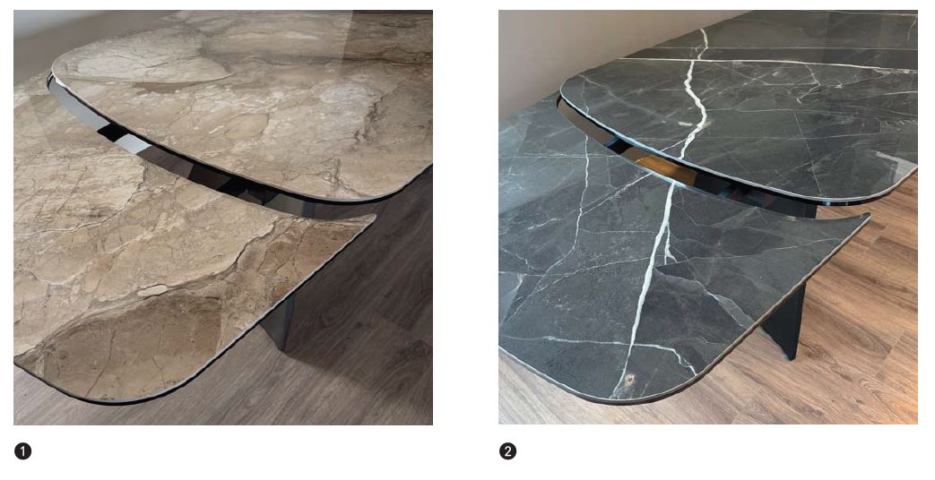 Glam è uno splendido tavolo allungabile dalla sagoma a botte caratterizzato da top in gres lucido ed una struttura a due gambe estremamente ricercata. Le gambe, uniche nel suo genere, sono realizzate con uno scatolato in solida lamina d’acciaio creato dalla combinazione di tre curve ad ampio raggio, verniciate a polveri epossiche con finitura sablé, e si sposa perfettamente con i sofisticati top in gres 6 mm accoppiato a vetro fumé temperato da 10 mm. Le misure di questo tavolo sono decisamente importanti. Chiuso misura 200 x 98 cm ed aperto con 2 allunghe da 45 cm cadauna raggiunge i 290 cm di lunghezza. Disponibile in 2 varianti colore, marmo lucido desert brown (dai toni caldi e ambarati) combinato a struttura bronzo sablé oppure marmo