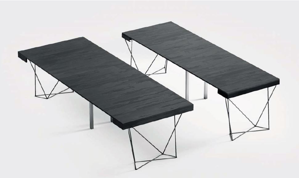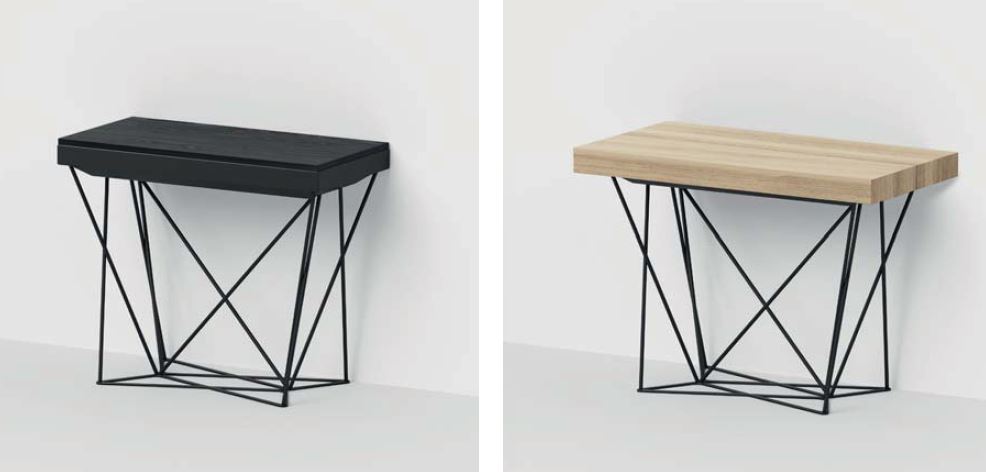 TAVOLO CONSOLLE ALLUGABILE CON STRUTTURA IN LAMINA D'ACCIAIO E GAMBE IN ACCIAIO TONDO PIENO DA 12MM VERNICIATE CON FINITURA SABLE'. IL TOP E LE 5 ALLUNGHE IN DOTAZIONE SONO REALIZZATI IN LAMINATO ECOLOGICO SPESSORE 18MM. DEL TOP ESISTONO 2 VERSIONI. LA VERSIONE STANDARD DA 90 E QUELLA IN FOLDING PIU' LARGA DA 110 E PIU' LUNGA. LA GUIDA ESTENSIBILE E' IN ALLUMINIO. LE GAMBE PIEGHEVOLI DI SOSTEGNO SONO IN ACCIAIO INOX