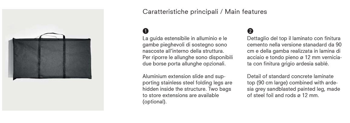 TAVOLO CONSOLLE ALLUGABILE CON STRUTTURA IN LAMINA D'ACCIAIO E GAMBE IN ACCIAIO TONDO PIENO DA 12MM VERNICIATE CON FINITURA SABLE'. IL TOP E LE 5 ALLUNGHE IN DOTAZIONE SONO REALIZZATI IN LAMINATO ECOLOGICO SPESSORE 18MM. DEL TOP ESISTONO 2 VERSIONI. LA VERSIONE STANDARD DA 90 E QUELLA IN FOLDING PIU' LARGA DA 110 E PIU' LUNGA. LA GUIDA ESTENSIBILE E' IN ALLUMINIO. LE GAMBE PIEGHEVOLI DI SOSTEGNO SONO IN ACCIAIO INOX