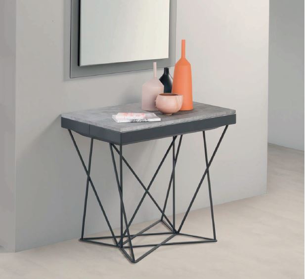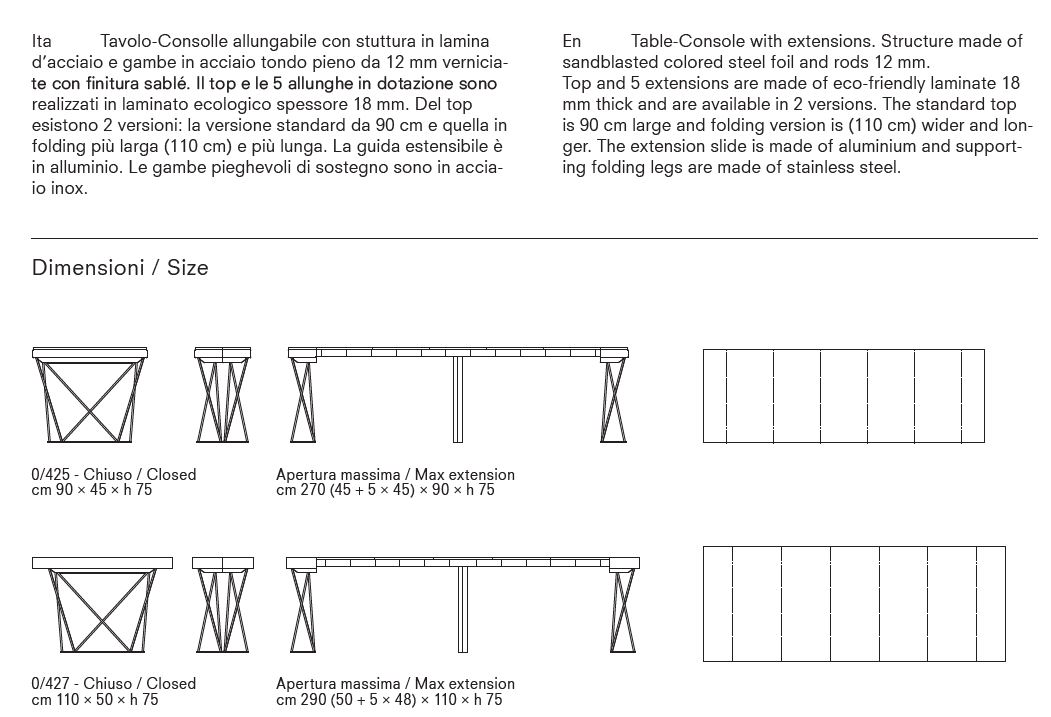 TAVOLO CONSOLLE ALLUGABILE CON STRUTTURA IN LAMINA D'ACCIAIO E GAMBE IN ACCIAIO TONDO PIENO DA 12MM VERNICIATE CON FINITURA SABLE'. IL TOP E LE 5 ALLUNGHE IN DOTAZIONE SONO REALIZZATI IN LAMINATO ECOLOGICO SPESSORE 18MM. DEL TOP ESISTONO 2 VERSIONI. LA VERSIONE STANDARD DA 90 E QUELLA IN FOLDING PIU' LARGA DA 110 E PIU' LUNGA. LA GUIDA ESTENSIBILE E' IN ALLUMINIO. LE GAMBE PIEGHEVOLI DI SOSTEGNO SONO IN ACCIAIO INOX
