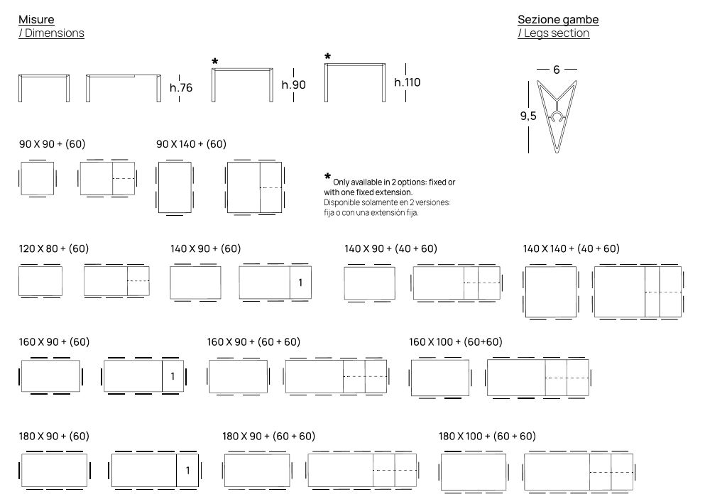 LA VERSIONE ALLUNGABILE E' PROPOSTA CON UN ALLUNGA FISSA DA CM.60 OPPURE CON 2 ALLUNGHE A LIBRO DA 40 O 60 CM. CIASCUNA. IL PIANO E LE ALLUNGHE PRESENTANO UN BORDO BISELLATO, CHE DONA L'EFFETTO VISIVO DI UN PIANO DALLO SPESSORE DI SOLI 6MM