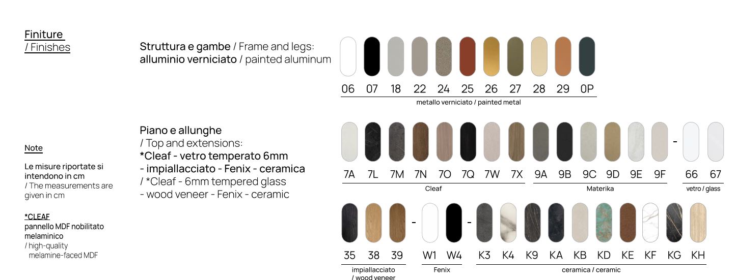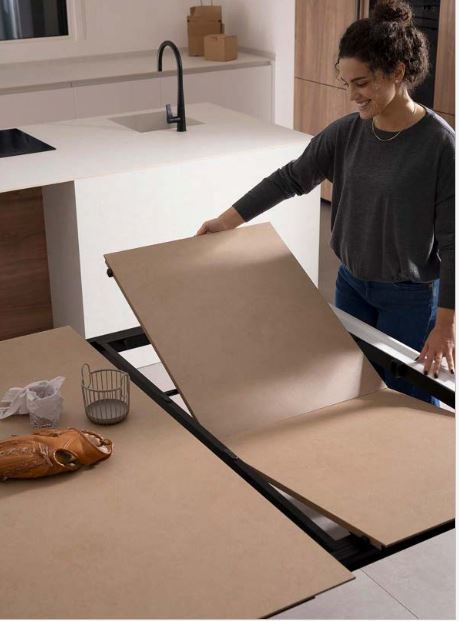 LA VERSIONE ALLUNGABILE E' PROPOSTA CON UN ALLUNGA FISSA DA CM.60 OPPURE CON 2 ALLUNGHE A LIBRO DA 40 O 60 CM. CIASCUNA. IL PIANO E LE ALLUNGHE PRESENTANO UN BORDO BISELLATO, CHE DONA L'EFFETTO VISIVO DI UN PIANO DALLO SPESSORE DI SOLI 6MM