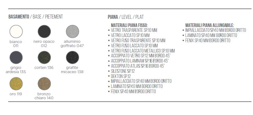 STRUTTURA METALLO COLORI : BIANCO 011, NEROI OPACO 012, ALLUMINIO GOFFRATO 047, GRIGIO ARDESIA 135, CORTEN 136, GRAFITE MICACEO 138, ORO 119, BRONZO CHIARO 140