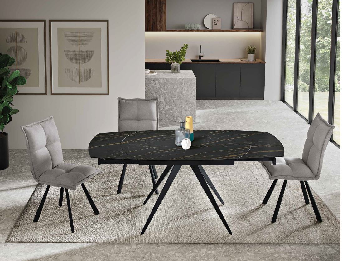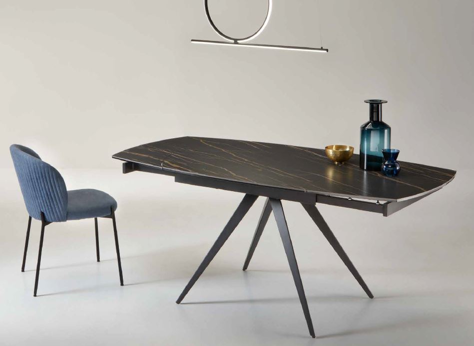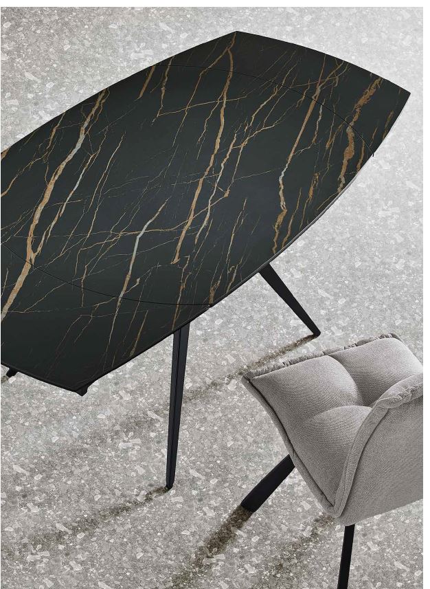 Tavolo allungabile telescopico con base in metallo verniciato e top in grès porcellanato effetto marmo nero opaco