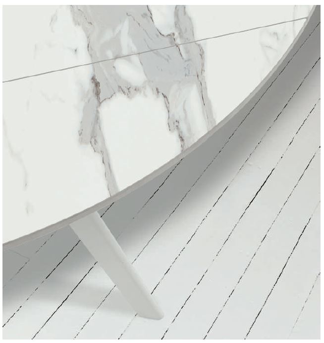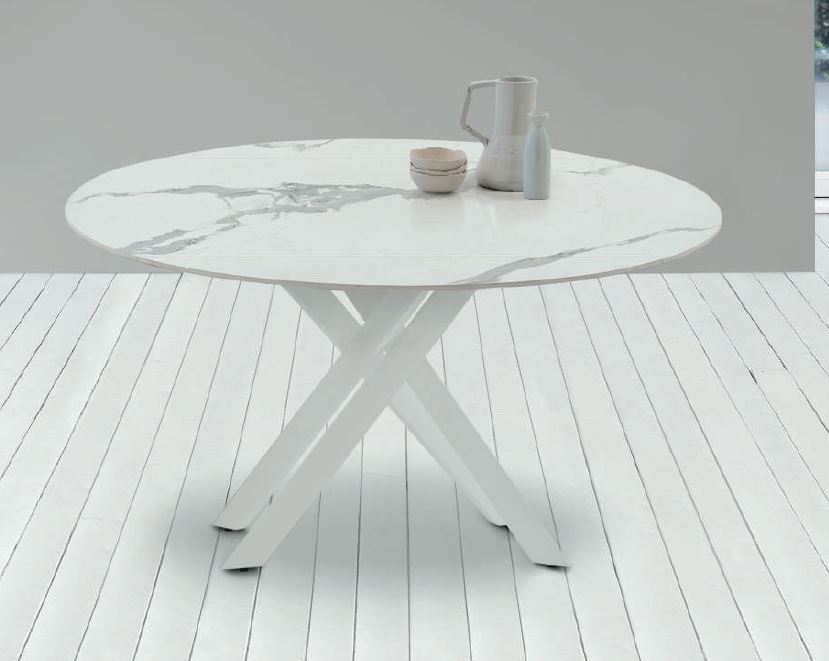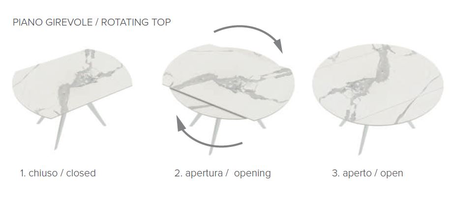 TAVOLO ALLUNGABILE CON STRUTTURA IN METALLO VERNBICIATO E PIANO GIREVOLE SEMIAUTOMATICO A BOTTICELLA CHE SI TRASFORMA IN ROTONDO IN GRES PORCELLANATO EFFETTO MARMO SPESSORE 12MM