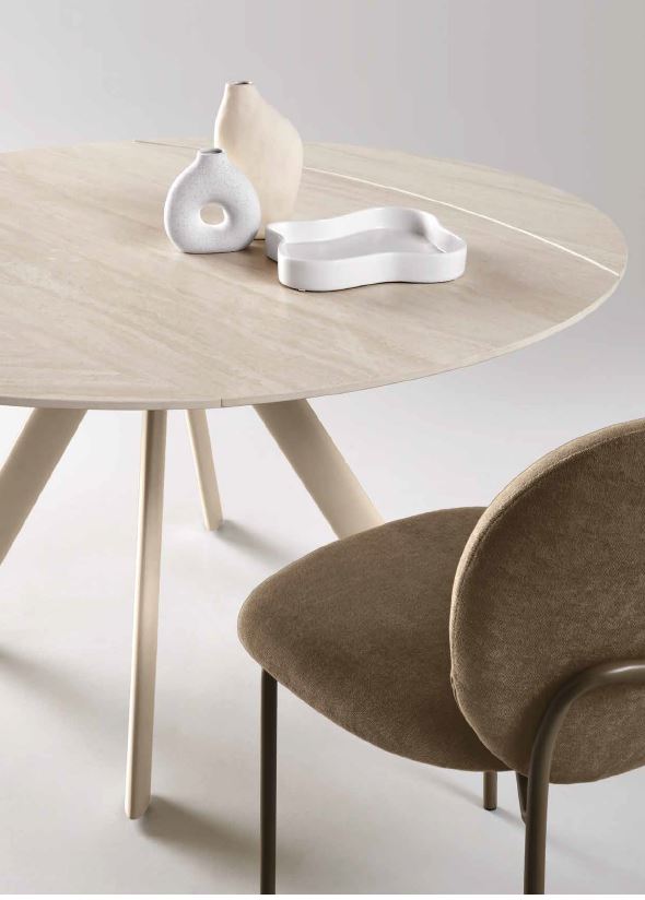 Tavolo allungabile dotato di meccanismo girevole, trasformabile in rotondo mediante due allunghe da 24 cm.