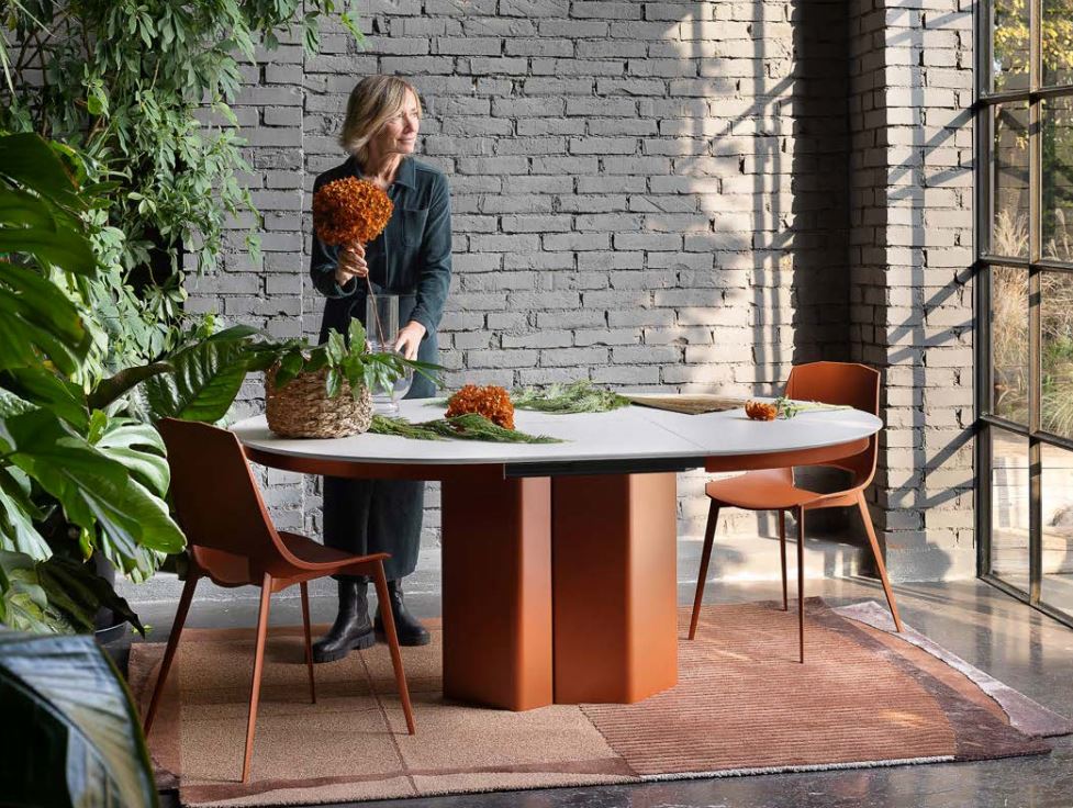 Metra è un tavolo dal carattere deciso e contemporaneo, definito da una base in lamiera verniciata a polveri e disponibile in diverse finiture. Proposto nelle versioni fissa e allungabile, Metra può essere abbinato a piani in Cleaf, ceramica o impiallacciato rovere, offrendo soluzioni versatili e di grande impatto visivo per l’area living.