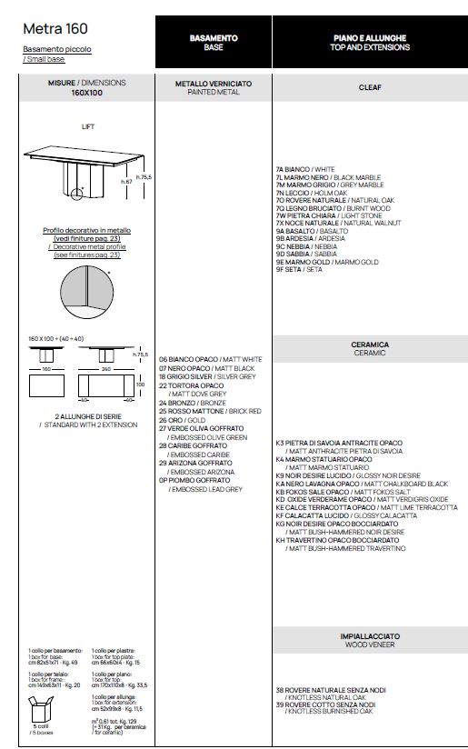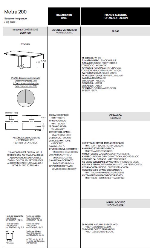 Metra è un tavolo dal carattere deciso e contemporaneo, definito da una base in lamiera verniciata a polveri e disponibile in diverse finiture. Proposto nelle versioni fissa e allungabile, Metra può essere abbinato a piani in Cleaf, ceramica o impiallacciato rovere, offrendo soluzioni versatili e di grande impatto visivo per l’area living.