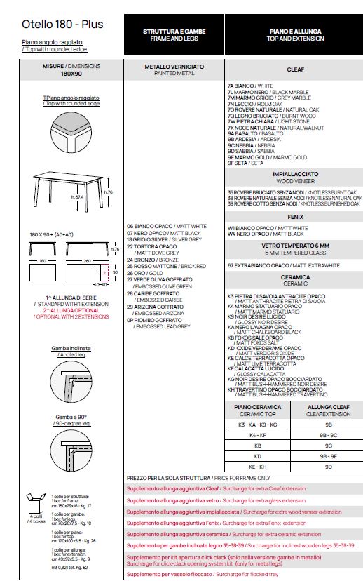 80X120 ALL.160, 80X140 ALUNGABILE 180-220 (SECONDA ALLUNGA OPTIONAL), 90X140 ALLUNGABILE 180-220 (SECONDA ALLUNGA OPTIONAL), 90X160 ALLUNGABILE 200-240 (SECONDA ALLUNGA OPTIONAL), 90X180 SOLO PLUS ALLUNGABILE 220-260 (SECONDA ALLUNGA OPTIONAL), 100X200 SOLO PLUS ALLUNGABILE 240-280 (SECONDA ALLUNGA OPTIONAL)