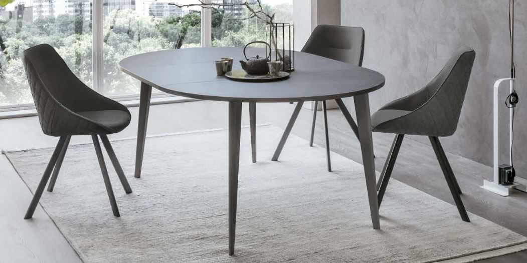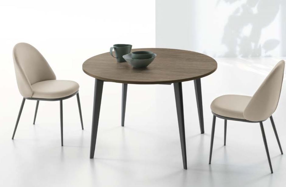 Tavolo allungabile con basamento in metallo verniciato. Piano rotondo che si trasforma in ovale con allunga centrale a